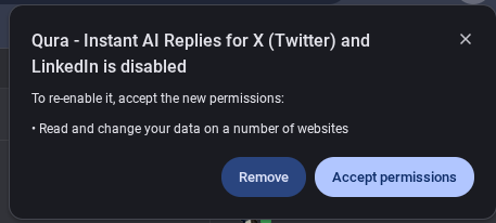 To take advantage of these new updates you will need to make sure that your Qura extension is running the latest update. Some of you may have noticed a notification when you opened your Chrome browser that looks a little like this: